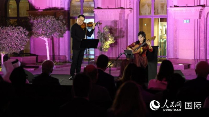 音乐会上,知名小提琴家宁峰和古典吉他演奏家杨雪霏联袂演绎中外经典曲目和阿联酋作曲家达尔维什作品,引发全场共鸣,掌声经久不息。